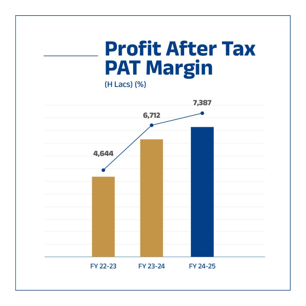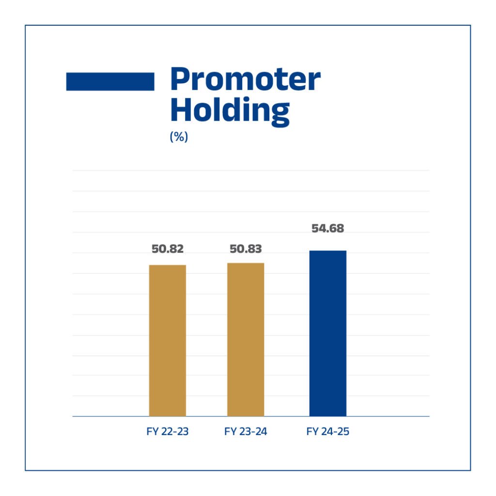 Promoter stake remains strong and is rising, signaling long-term commitment and confidence. It stood at 50.82% in FY 22-23 and 50.83% in FY 23-24, and is projected to reach 54.68% in FY 24-25, underscoring alignment with shareholders and conviction in our business strategy.